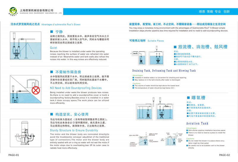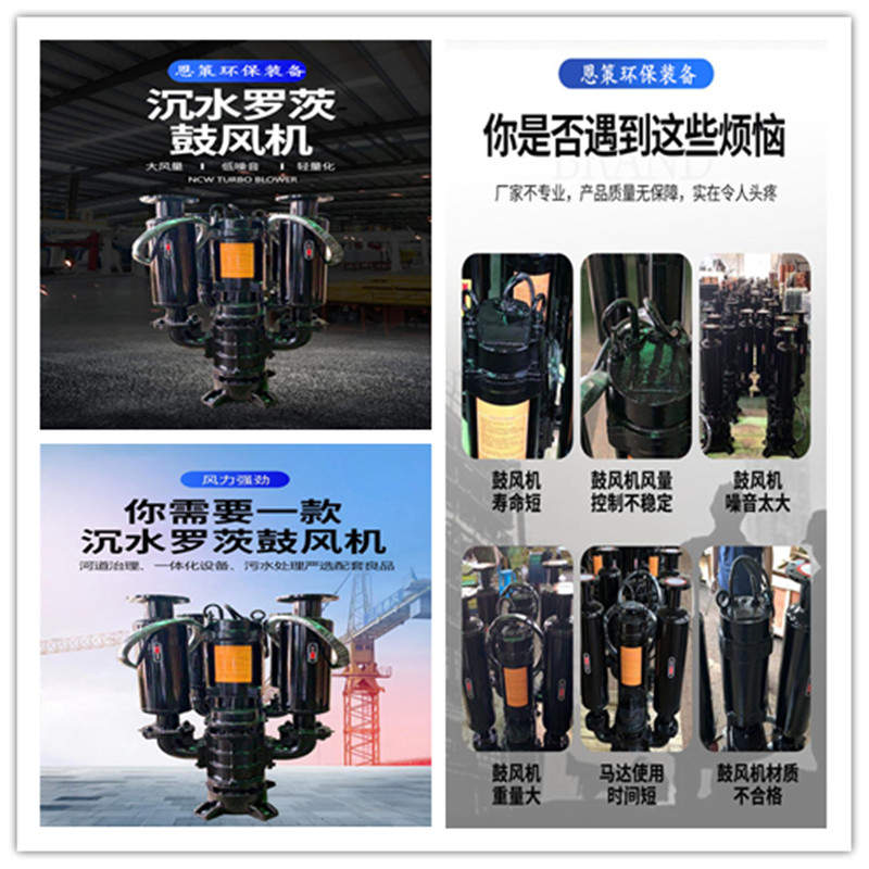 轉(zhuǎn)。沉水式鼓風機安裝于水底,連接管路開孔曝氣,通過曝氣復氧法來進行污水處理。